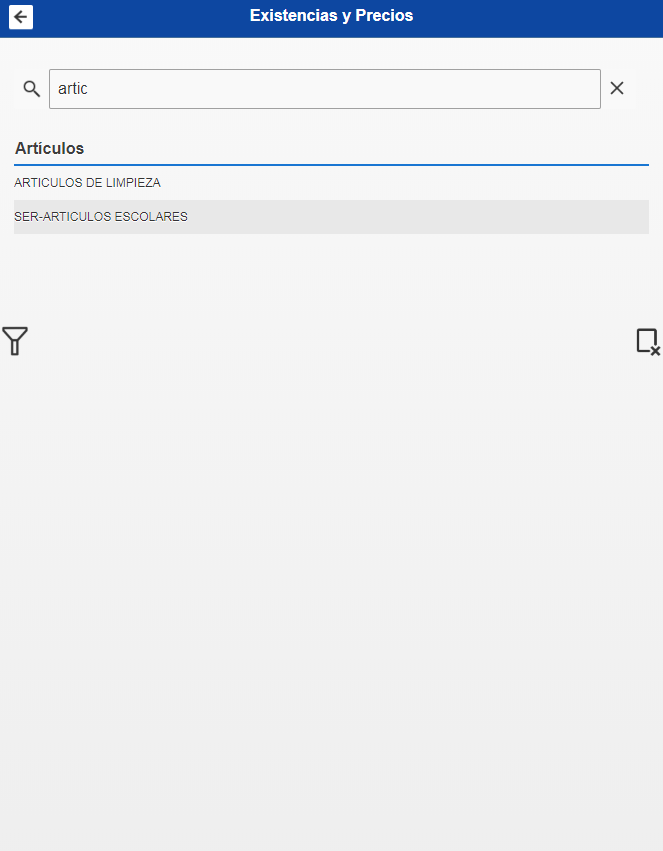 Al Seleccionar el cliente observará que el sistema regresa a la pantalla de inicio del eFactory Super mobile, esto significa que el Cliente ya ha sido seleccionado, es decir, cada movimiento que haga de ahora en adelante será sobre este cliente. A continuación debe hacer click sobre la opción Existencias y Precios.