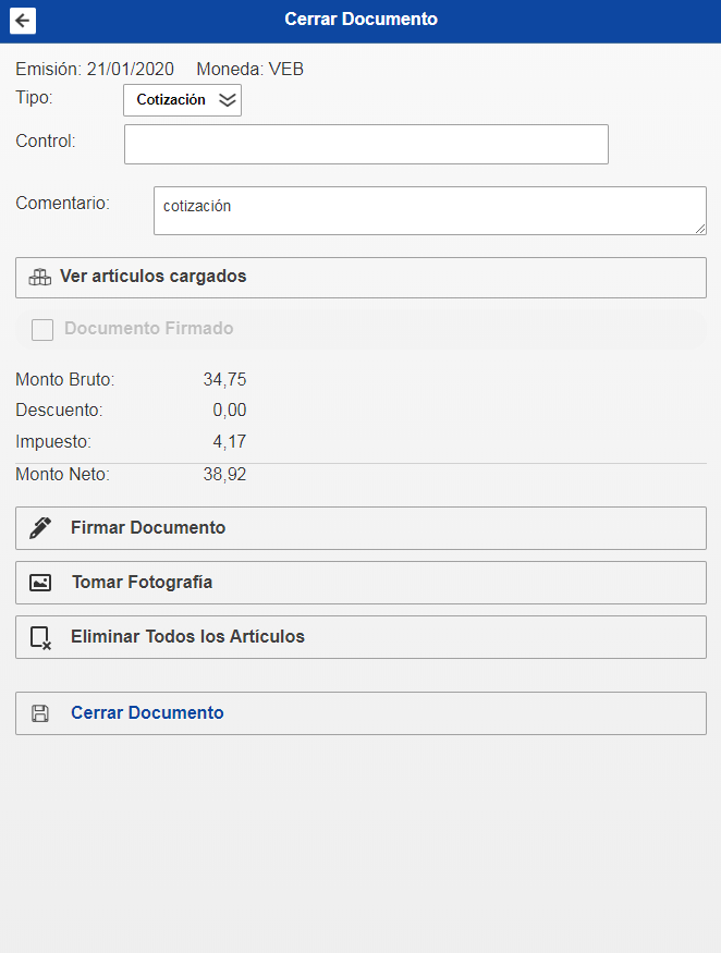 Para Finalizar y agregar la cotización debe hacer click en la opción Cerrar Documento, esto le mostrará un mensaje de confirmación en el cual debe presionar aceptar y se habrá agregado la cotización.