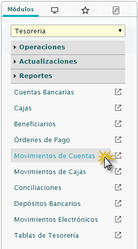 b. Luego de ingresar en eFactory debemos seleccionar el módulo Tesorería, componente Actualizaciones, maestro Movimientos de Cuentas.