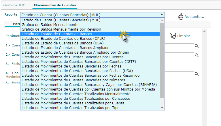 a. Al seleccionar el maestro correspondiente nos muestra la ventana donde ubicamos el campo Reportes y se desplegara un panel en el cual deberemos desplegar la lista que reportes que se encuentran disponibles como lo muestra la imagen, luego seleccionaremos "Listado de Estado de Cuentas de Bancos".