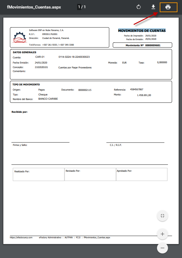 a. Se nos desplegara una ventana en la cual podremos ver una vista previa del reporte seleccionado. Para imprimirla solo deberemos oprimir el botón en forma de impresora que se encuentra en la parte superior derecha de la ventana.