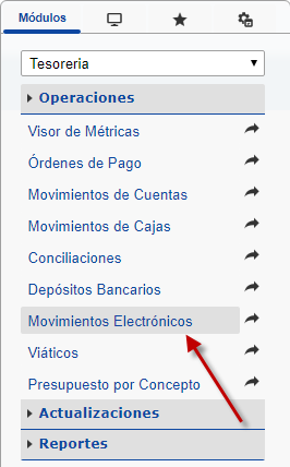 a. Luego de ingresar al sistema administrativo seleccionaremos el modulo de "Tesoreria" y desplegaremos la seccion de "Operaciones" luego de esto presionaremos la opción "Movimientos Electronicos".