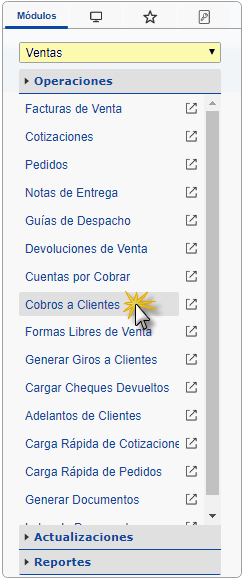 b. En el módulo Ventas, desplegamos el componente Operaciones y activamos el sub componente Cobros a Clientes