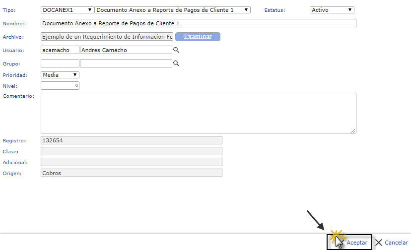 c. Después se procede a llenar los siguientes datos: Tipo, Nombre, Archivo, Usuario, Grupo, Prioridad, Nivel, Comentario, Registro, Clase, Adicional y Origen, luego seleccionaremos el botón