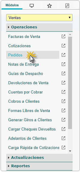 b. En el módulo Ventas, desplegamos el componente Operaciones y activamos el sub componente Pedidos