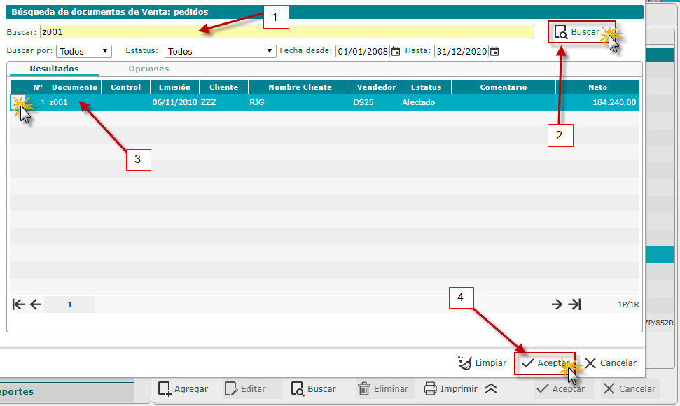 b. Luego observaremos la ventana de Búsqueda de documentos de Venta: Pedidos donde buscaremos el pedido, colocando el nombre o código y se procede a seleccionar el botón