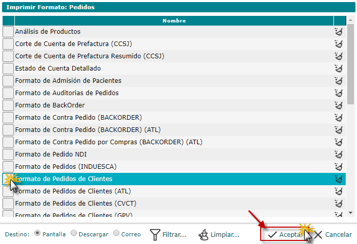 se muestra la ventana Imprimir Formato de Pedidos de Clientes donde seleccionaremos el