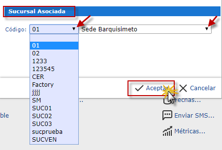 b. Luego observaremos la ventana Sucursal Asociada donde se procede a desplegar la lista y seleccionar la sucursal deseada, después seleccionaremos el botón