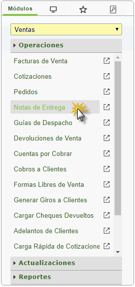 b. En el módulo Ventas, desplegamos el componente Operaciones y activamos el sub componente Notas de Entrega