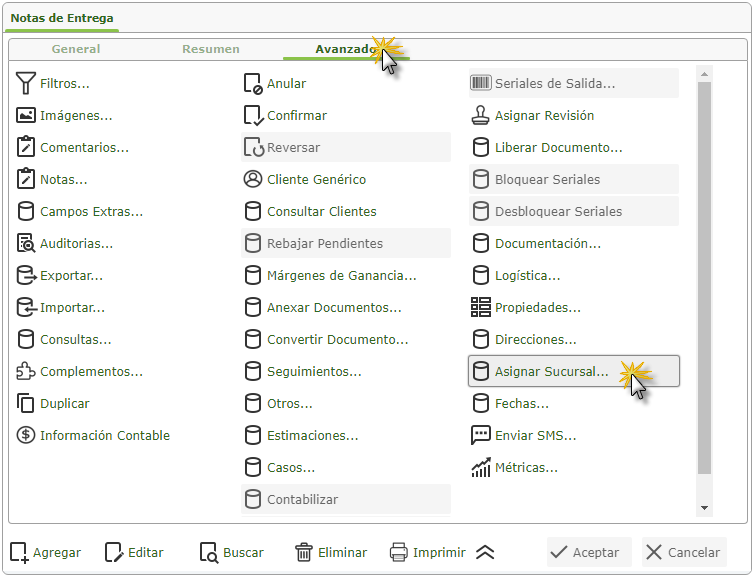 a. Al seleccionar el sub. componente Notas de Entrega se muestra su pantalla donde seleccionaremos la ficha Avanzado y procedemos a seleccionar el botón