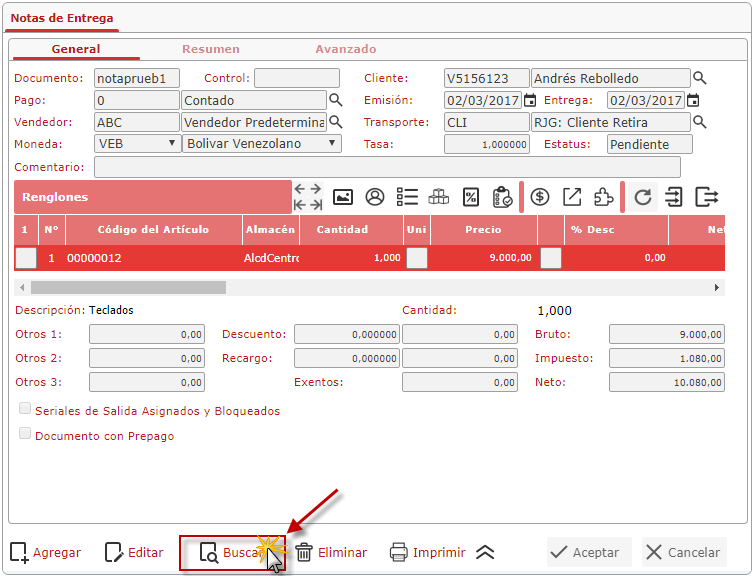 a. Para buscar una nota de entrega nos ubicamos en la pantalla que se muestra al seleccionar el sub. componente Notas de Entrega donde seleccionaremos el botón