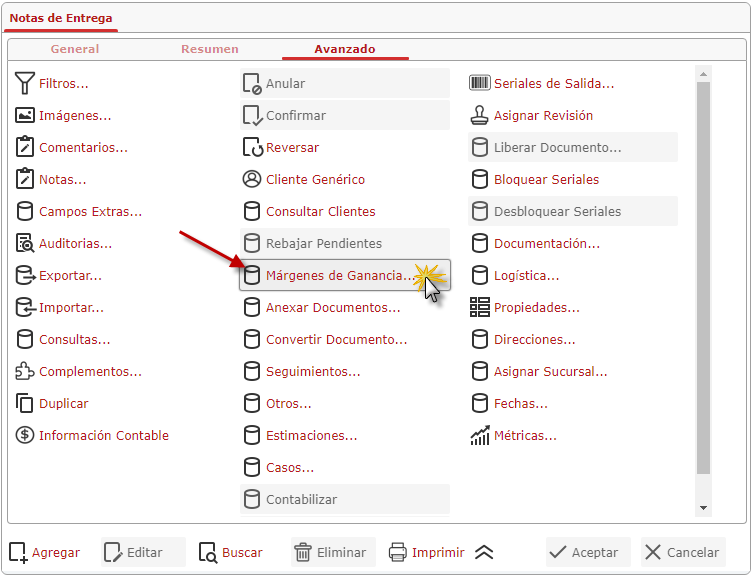 para buscar la nota de entrega que deseamos consultar los Márgenes de Ganancias.