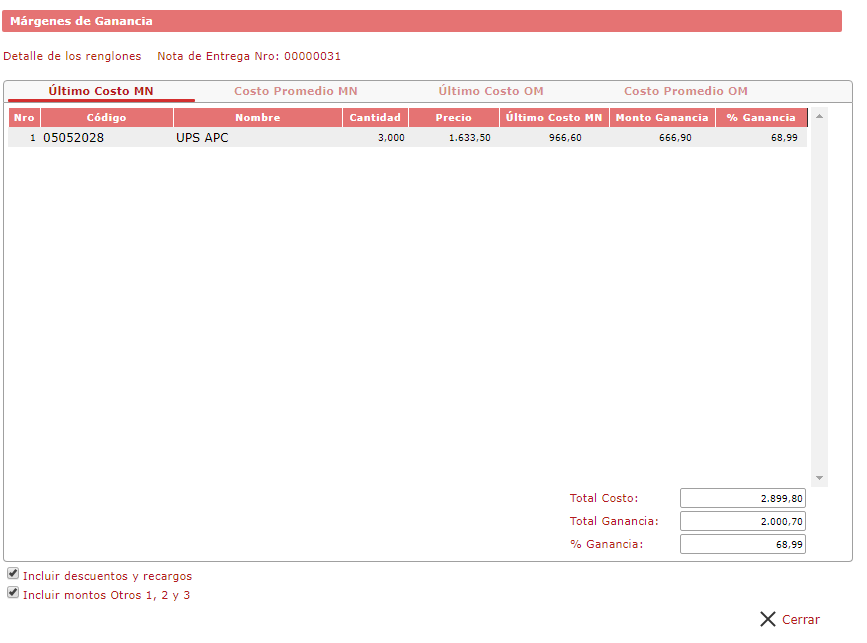 b. Después se muestra la ventana de Márgenes de Ganancias en la cual podrá observar en los renglones los artículos de la nota de entrega con su información. Esta ventana está dividida en 4 pestañas, las dos primeras con los Márgenes de Ganancias con respecto a la Moneda Nacional (Principal) y las dos siguientes con los márgenes con respecto a la Moneda Secundaria en la que fue registrada el artículo. Si Seleccionamos las dos opciones de Incluir descuentos y recargos y la Incluir monto otros 1, 2 y 3 se va a incluir los montos y descuentos que se encuentre en la ficha general de la nota de entrega seleccionada.