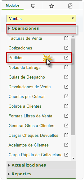 b. En el módulo Ventas, desplegamos el componente Operaciones y activamos el sub componente Pedidos