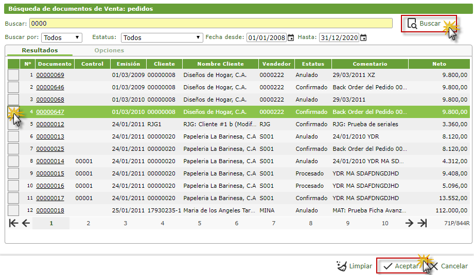 para buscar el pedido que deseamos convertir en una Factura de Venta.