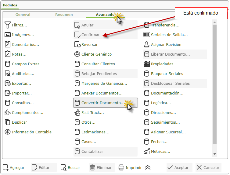 a. Al haber buscado el pedido nos ubicamos en la ficha Avanzado de la pantalla del pedido seleccionado y verificamos que el pedido este