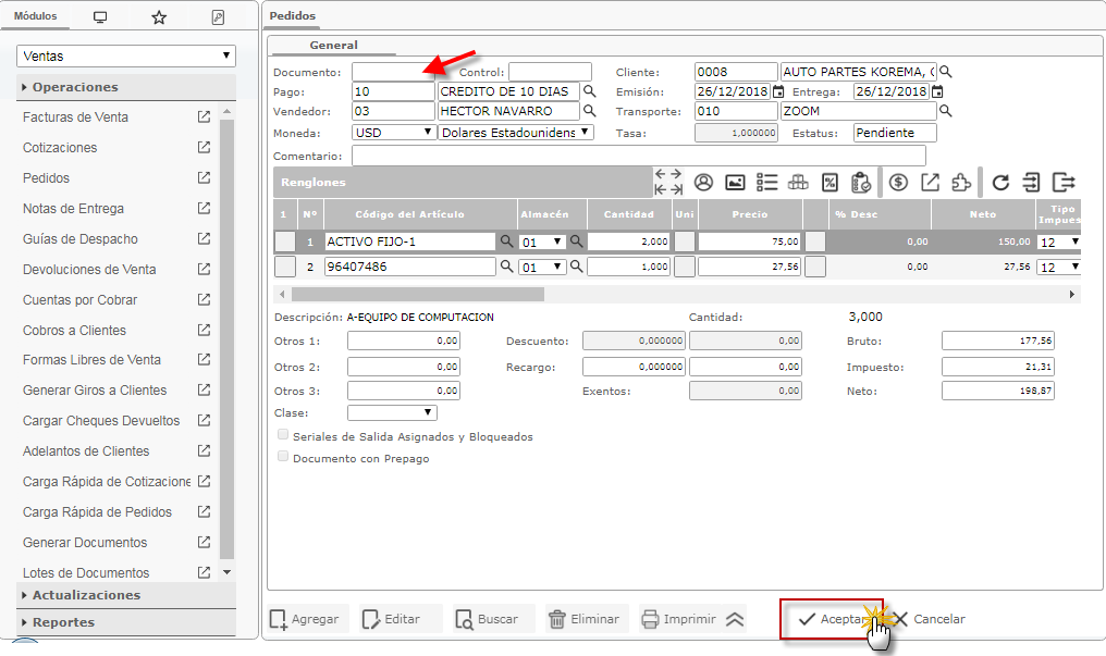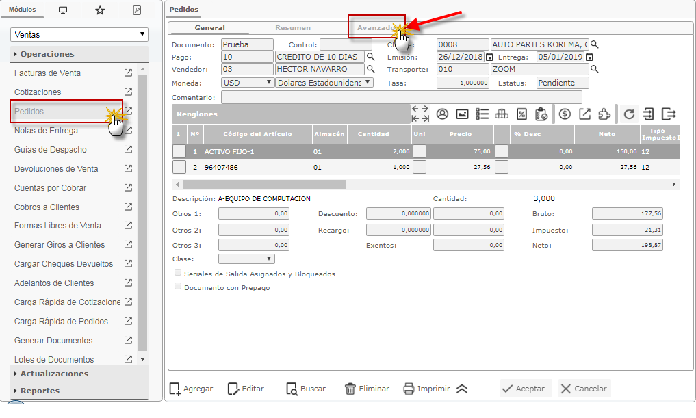 Operaciones y activamos el maestro Pedidos y presionamos el botón