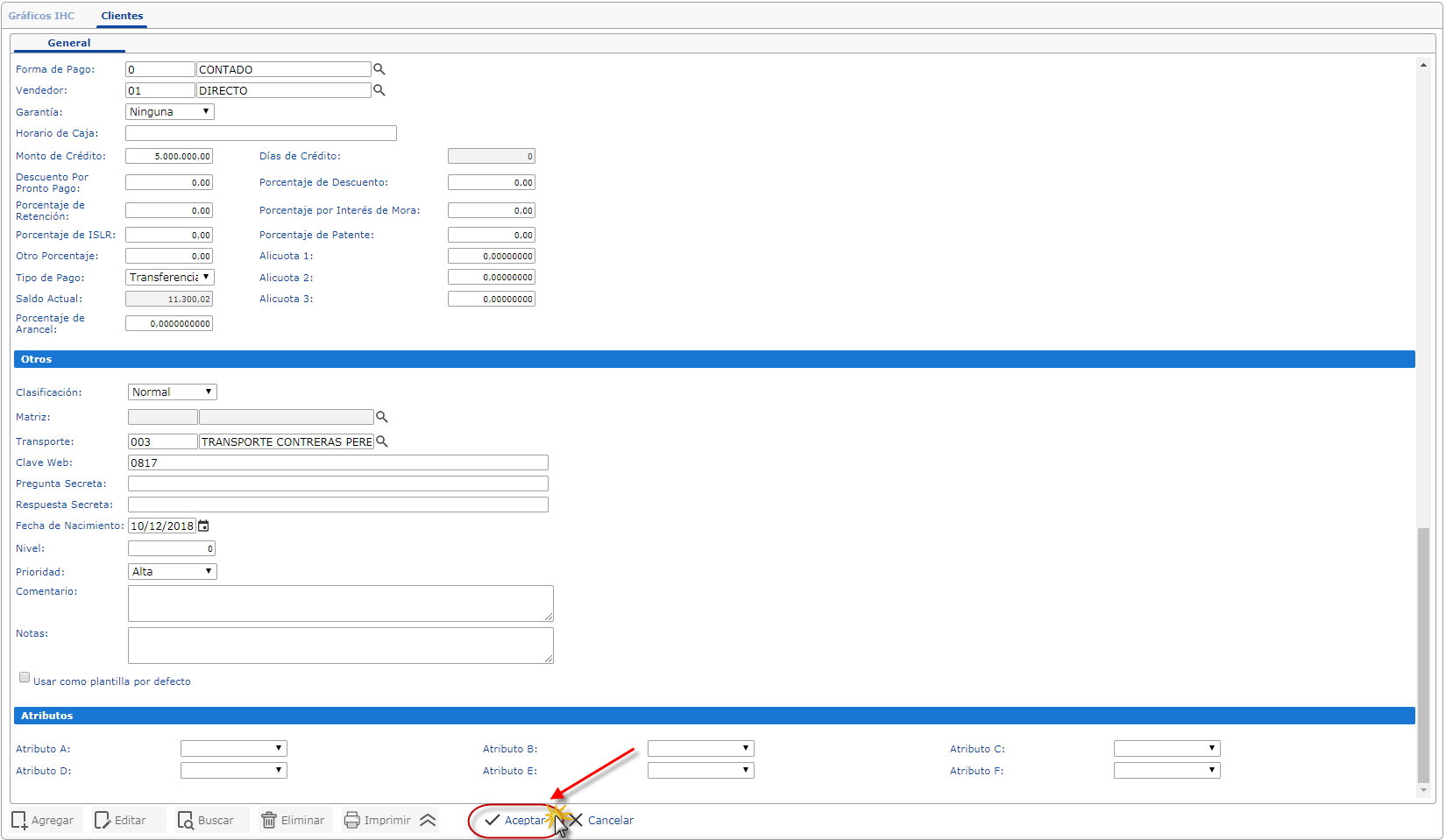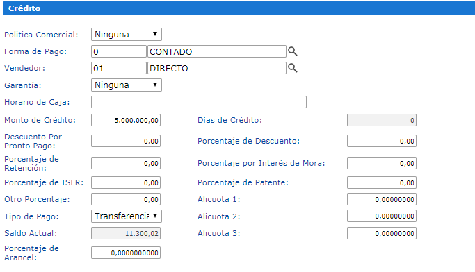 Los campos Política comercial, forma de pago, vendedor, garantía y tipo de pago no pueden quedar en blanco, son obligatorios para la creación del cliente.
