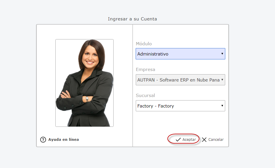 luego Seleccionamos el Módulo Administrativo, Empresa y Sucursal de la Empresa y presionamos el botón