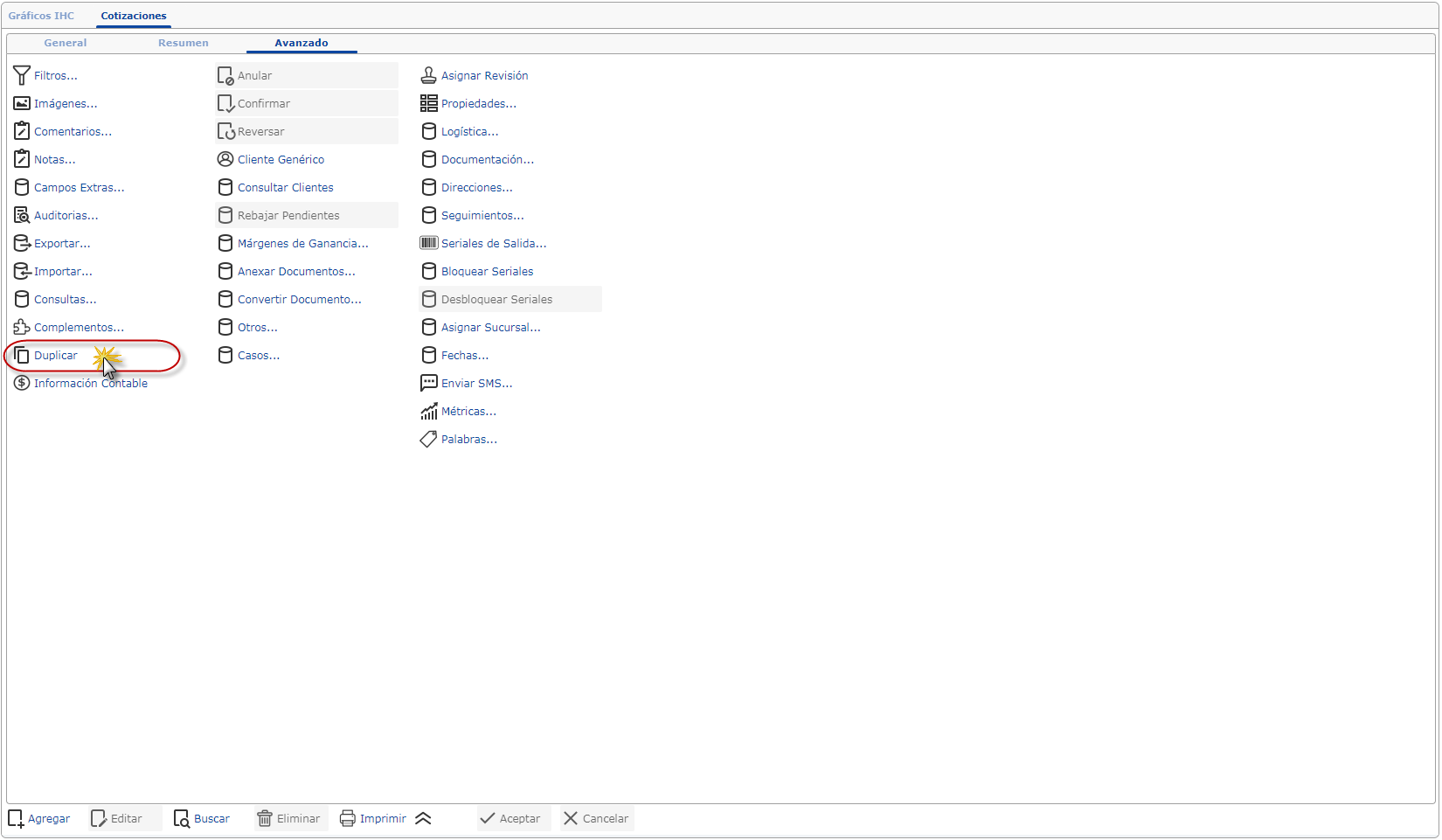 Otra forma de crear una cotización Accediendo a la pestaña Avanzado que se encuentra en la parte superior de la ventana Cotizaciones y presionar la opción Duplicar.