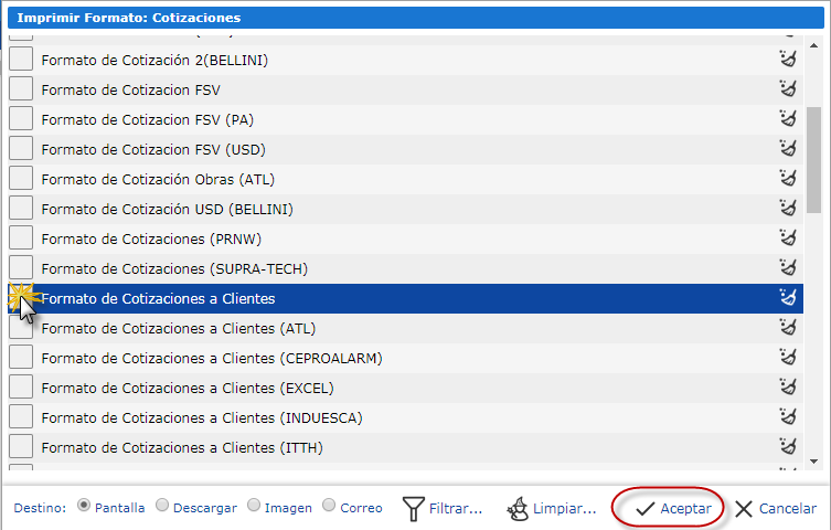 donde seleccionaremos el formato Formato de Cotizaciones a Clientes, luego de esto procedemos a seleccionar el botón