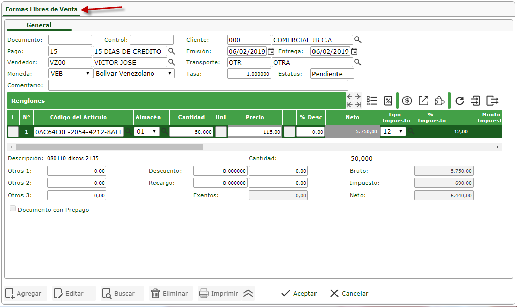 a. La pantalla está compuesta básicamente por tres secciones, la sección de inserción de Datos, donde se identifica al cliente, al vendedor, se define el número de control y tipo de pago, la sección Renglones en el que se ingresan los artículos, cantidades solicitadas, se identificara el almacén y porcentaje de descuento, y por último la sección de Totales donde se observa el monto bruto, impuesto y monto neto de la venta y también permite el ingreso de otros valores descuentos y recargos.