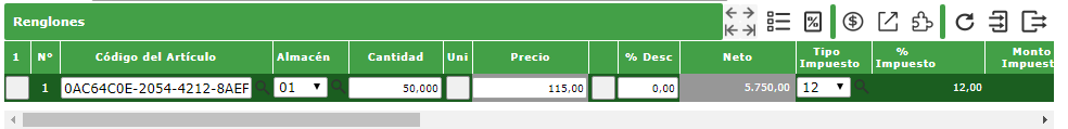 : Designa el articulo a gestionar en el renglón. A través del asisten de búsqueda podremos localizar en nuestra base de artículos los datos del artículo que necesitamos.