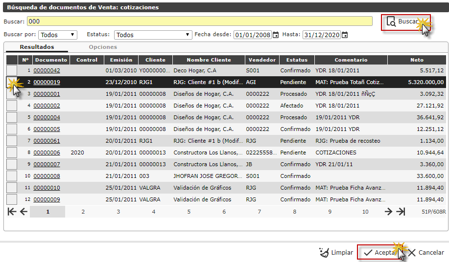 donde se muestra un listado de las Cotizaciones cargadas en el sistema, donde seleccionaremos el