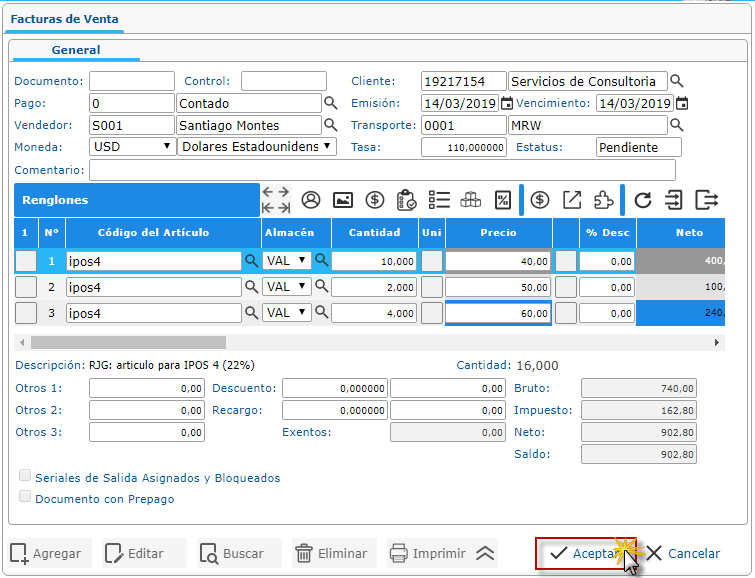 b. En el módulo Ventas, desplegamos el componente Operaciones y activamos el sub componente Facturas de Ventas