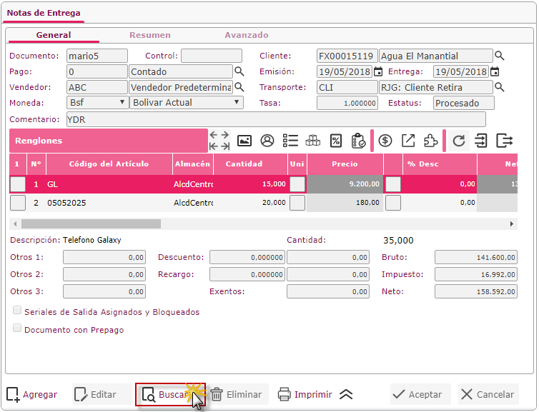 Nota: También podemos ubicarnos en la ficha Resumen y ir buscando la notas de entrega que deseemos duplicar.