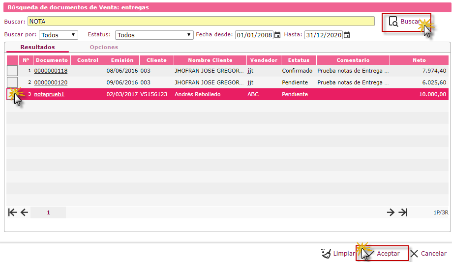donde se muestra un listado de las notas de entrega cargadas en el sistema, donde seleccionaremos el