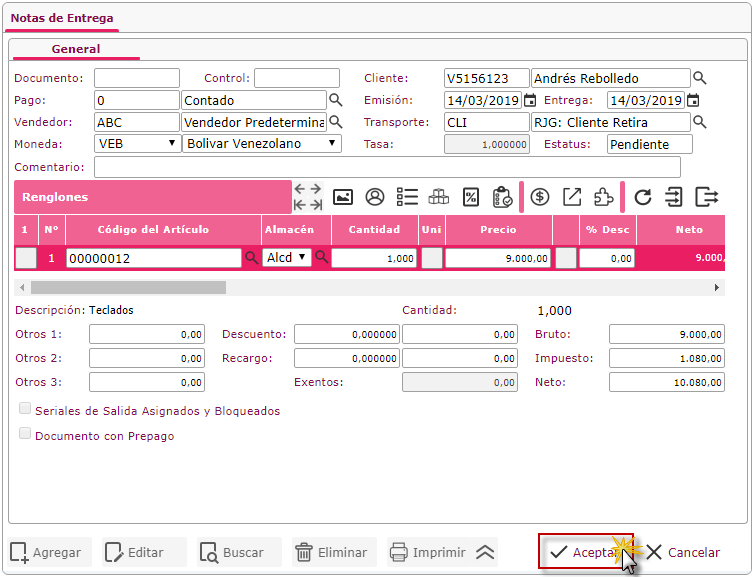 que se encuentra ubicado del lado izquierdo del código de la notas de entrega y se procede automáticamente a seleccionar el botón