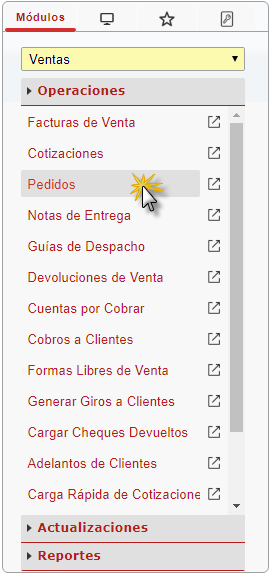 b. En el módulo Ventas, desplegamos el componente Operaciones y activamos el sub componente pedidos