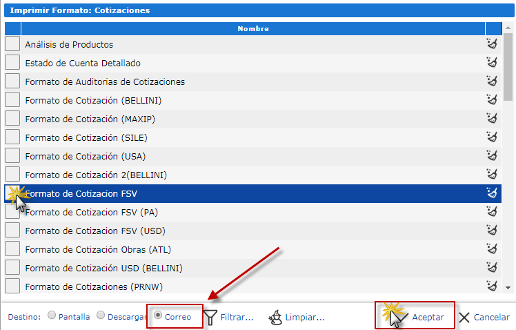 lo que abrirá una ventana para seleccionar el formato de la cotización.