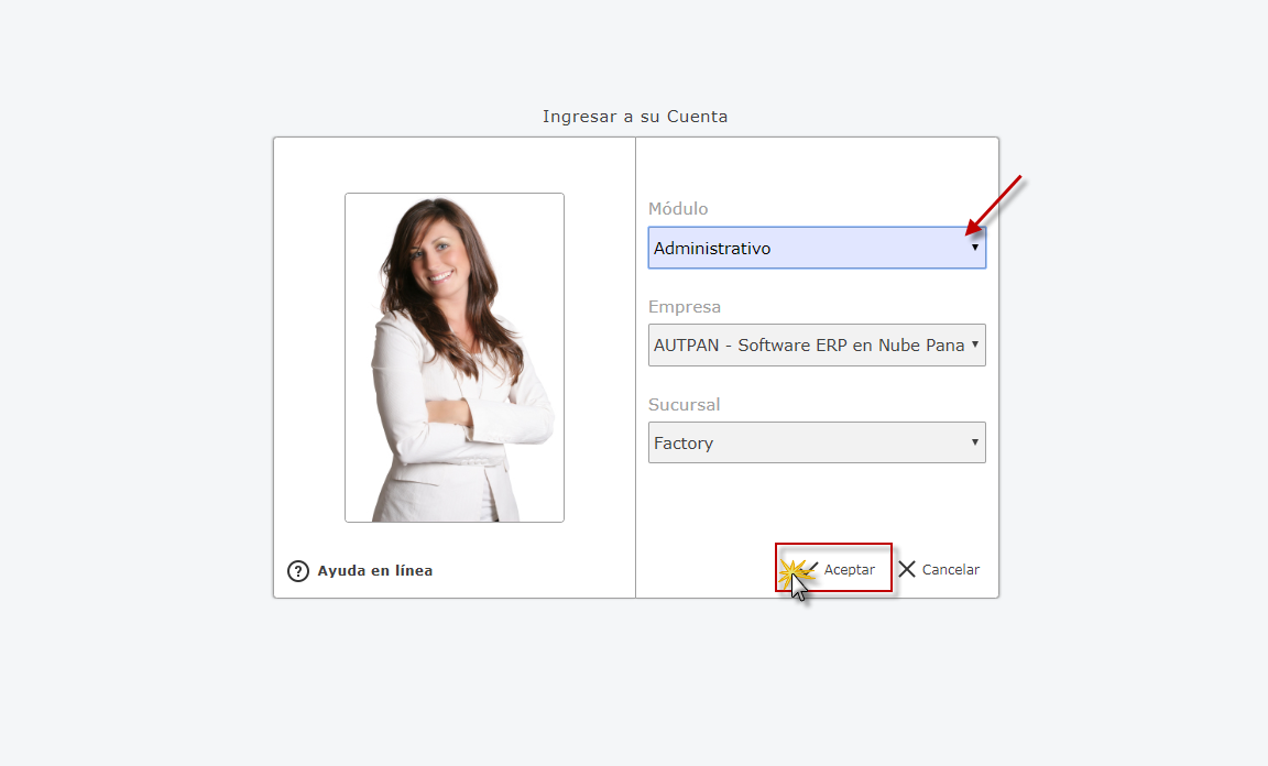 luego Seleccionamos el Módulo Administrativo, Empresa y Sucursal de la Empresa y presionamos el botón