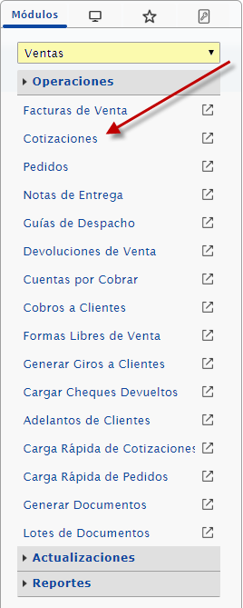 b. Luego seleccionaremos el módulo Ventas, desplegamos el componente Operaciones y activamos el sub componente Cotizaciones.