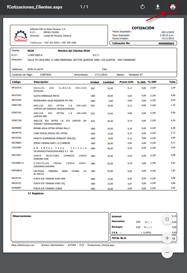 a. Al haber seleccionado el sub. componente Para imprimir una cotización a un