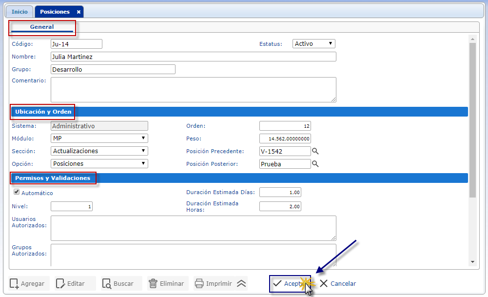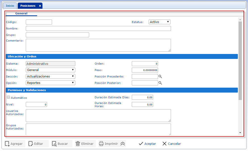 a. Para agregar posición luego de haber seleccionado el sub. componente Posiciones se muestra su pantalla correspondiente donde seleccionaremos el botón