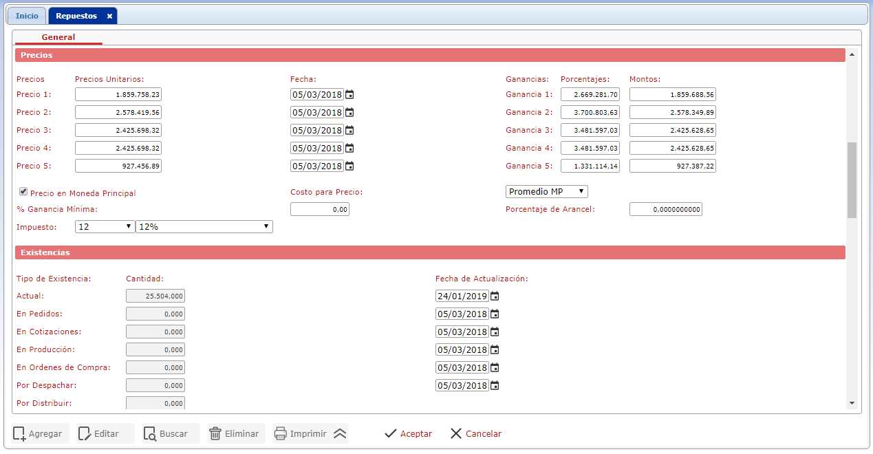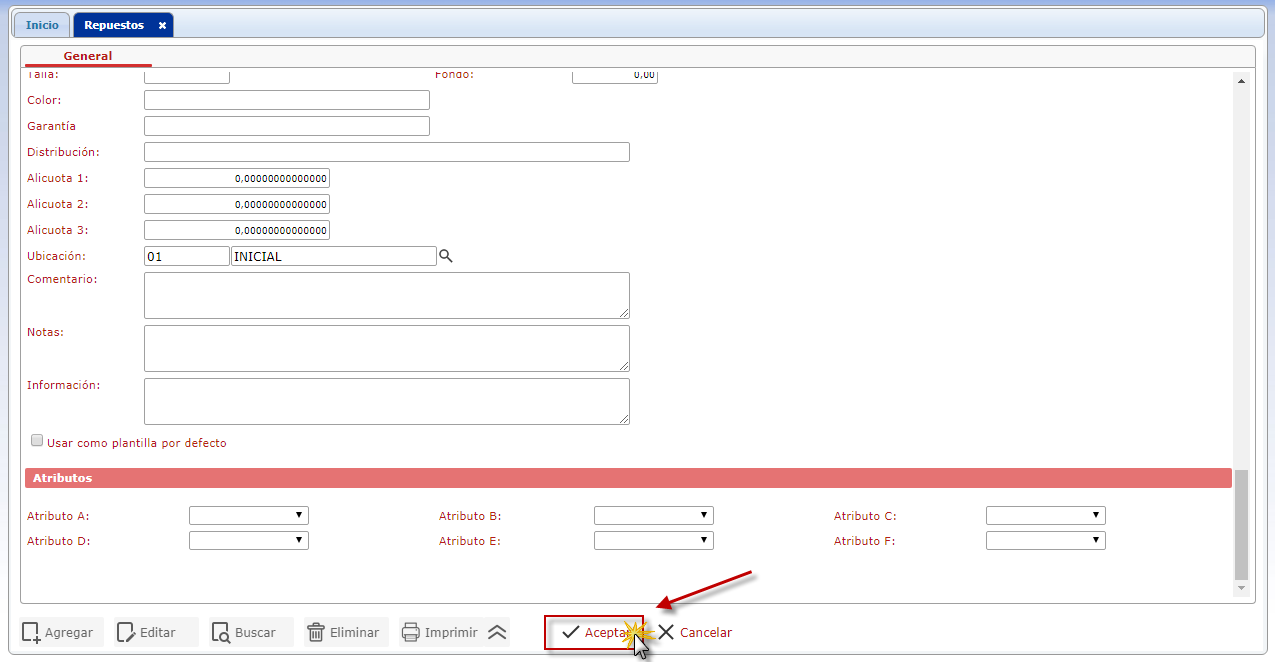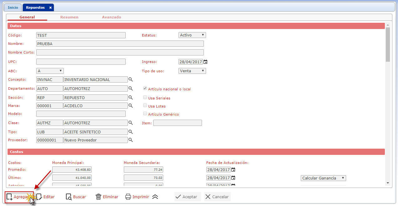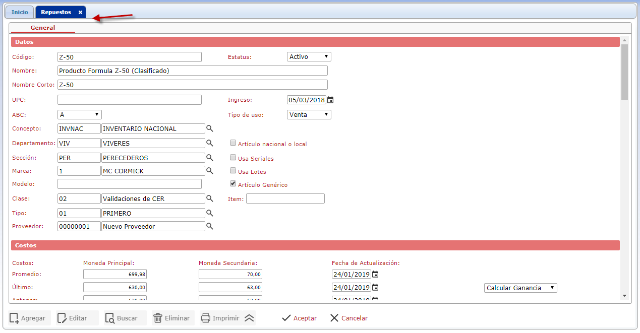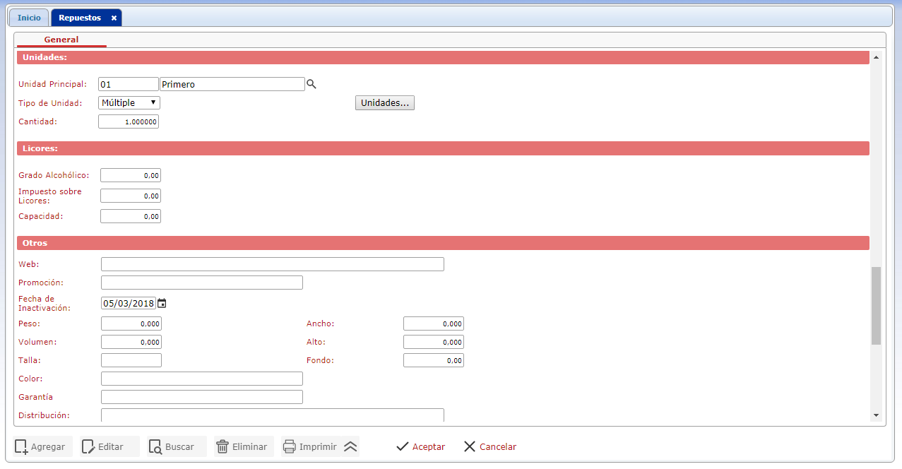 El formulario está compuesto por ocho secciones provistas para el manejo de Artículos y para el manejo de los Repuestos, por esta razón algunas secciones no aplicaran para la carga de un repuesto.