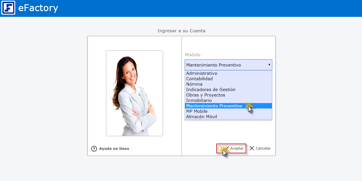 a. Al iniciar eFactory con nuestro Usuario y Contraseña, Seleccionamos el Módulo