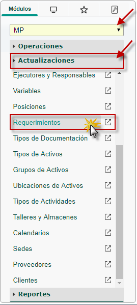 a. Al ingresar en el sistema debemos seleccionar el módulo "MP Mantenimiento Preventivo" y al desplegar la sección de "Actualizaciones" seleccionaremos la opción de Requerimientos.