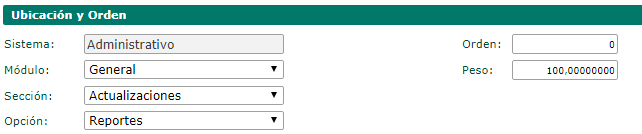 c. También tenemos la sección Ubicación y Orden lo cual esta diseñada para capturar la ubicación física del requerimiento que contienen los siguientes campos que son sistema, módulo, sección, opción, orden y peso.