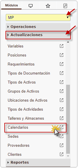 b. En el módulo MP, desplegamos el componente Actualizaciones y activamos el sub. componente Calendarios.