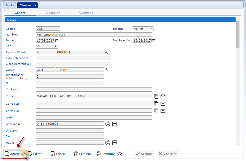 Luego de haber completado todos los datos de llendo de la agregación de un cliente, procedemos a seleccionar el botón