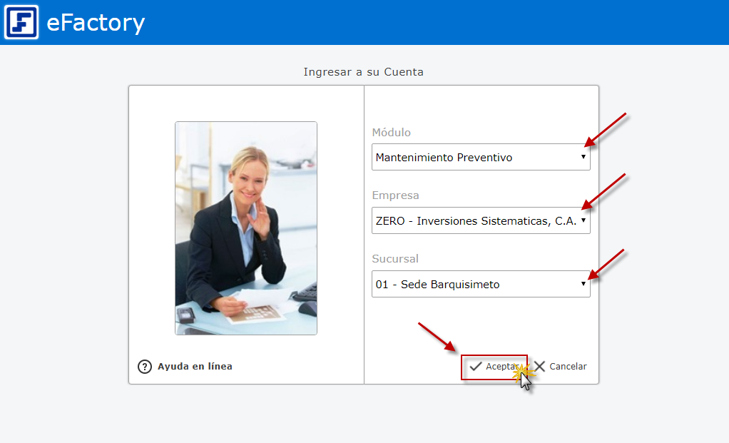 a. Al iniciar eFactory con nuestro Usuario y Contraseña, Seleccionamos el Módulo