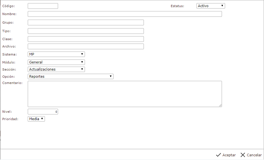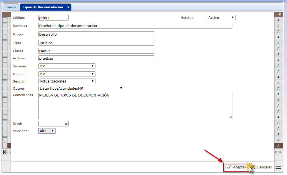 b. En el módulo MP, desplegamos el componente Actualizaciones y activamos el sub. componente Tipos de Documentación.