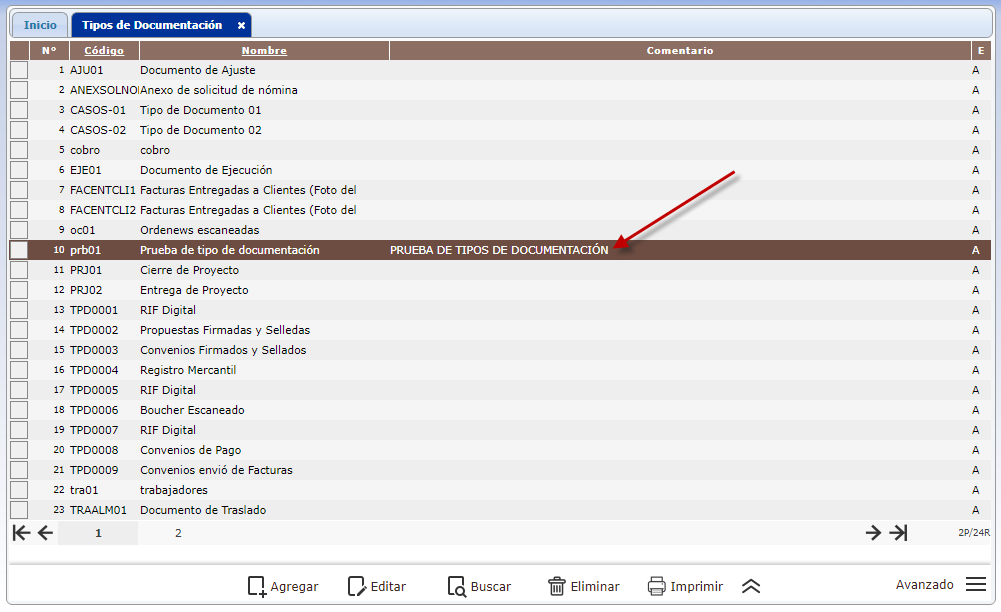 , se refleja el Tipo de Documentación agregado.