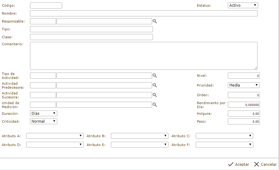 En esta sección también se puede definir el Nivel considerado de la actividad, su Prioridad, el Orden (sobre todo para actividades secuenciales) y Rendimiento por día de la actividad. Se puede definir por otra parte, la Holgura según el tipo de acoplamiento (si nuestra actividad se relaciona al trabajo con piezas), y el Peso de la pieza gestionada.