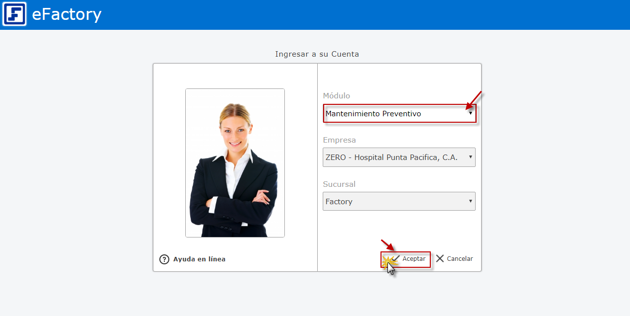a. Primero debemos ingresar al sistema Administrativo de eFactory colocando nuestro usuario y contraseña en la pantalla inicial de eFactory, luego presionaremos el botón de "Iniciar Sesión" y seleccionaremos el sistema de