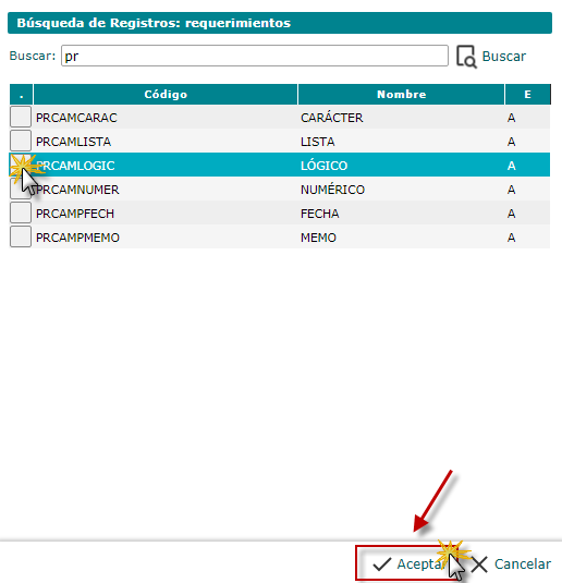 que se encuentra ubicado en la parte izquierda de cada nombre de requerimiento que se muestra en la búsqueda donde seleccionaremos el buscado y para finalizar la búsqueda procedemos a presionar el botón